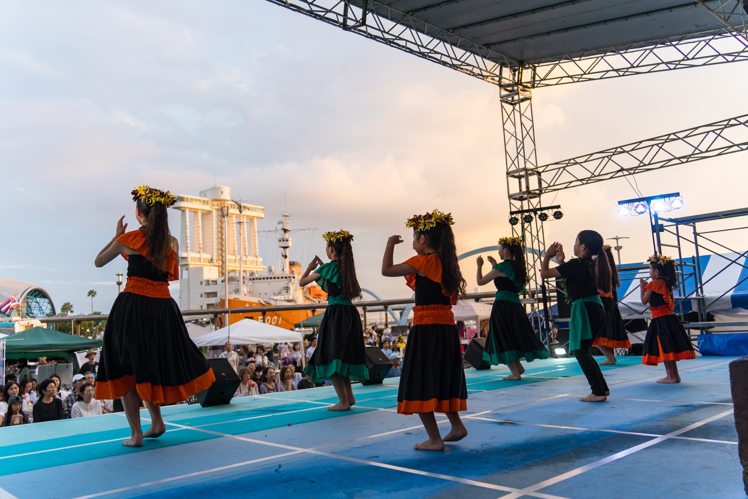 名古屋市港区、名古屋港水族館に隣接したジェティ前広場にて約700名の出演者参加のハワイアンイベント主催開催。